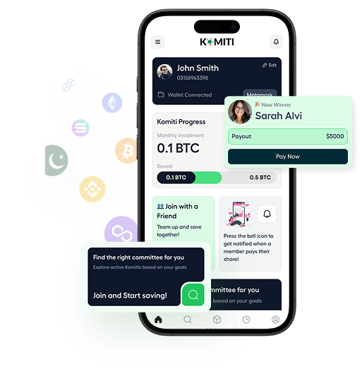 Komiti makes saving easy with full support for Pakistani Rupees and leading digital currencies — so you can contribute in the way that works best for you.